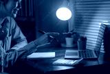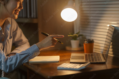 Young Asian businesswoman pointing at laptop screen and taking notes, working late at night in home office