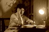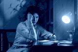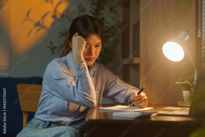 Young Asian woman working at home at night feeling stressed and tired, holding her head with her hand