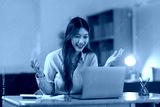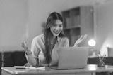 Happy Asian female entrepreneur gesturing enthusiastically while participating in an online meeting from her organized home office workspace