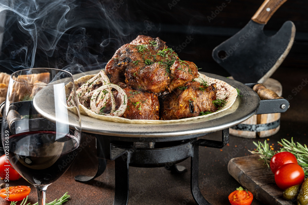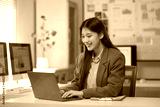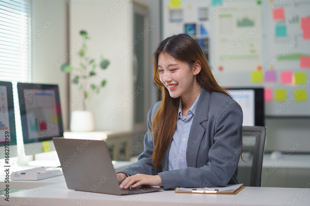 Asian businesswoman working on laptop computer in modern office smiling and typing, she's wearing a gray suit and a blue striped shirt