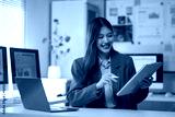 Asian businesswoman holding clipboard and reviewing financial documents, smiling while working with laptop and computer in modern office