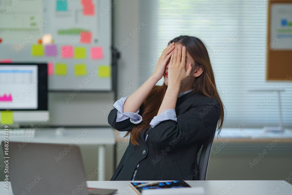 Businesswoman covering her face with hands, showing frustration and stress in a modern office environment