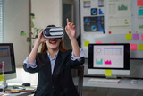 Businesswoman wearing virtual reality headset is interacting with metaverse and pointing finger in modern office