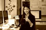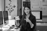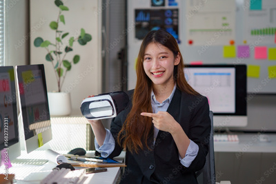 Asian businesswoman pointing at a VR headset while sitting at her desk in a modern office, embodying innovation and technology in the workplace