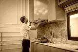 Man is seen in a modern kitchen, focused intently on working with a built-in oven appears to be either installing, repairing, or inspecting the appliance is house style living concept.