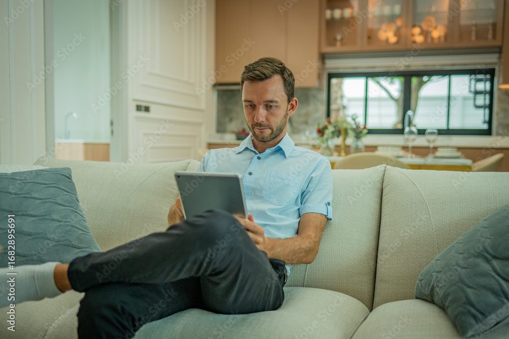 Man freelance business posing comfortably relaxed at home and working internet connection from home or enjoying a creative hobby in a peaceful environment ideal space for both work and leisure