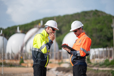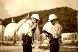 Engineer industrial facility petrochemical or gas energy site focused balance between industrial development and environmental preservation impact while maintaining efficiency and safety standards.