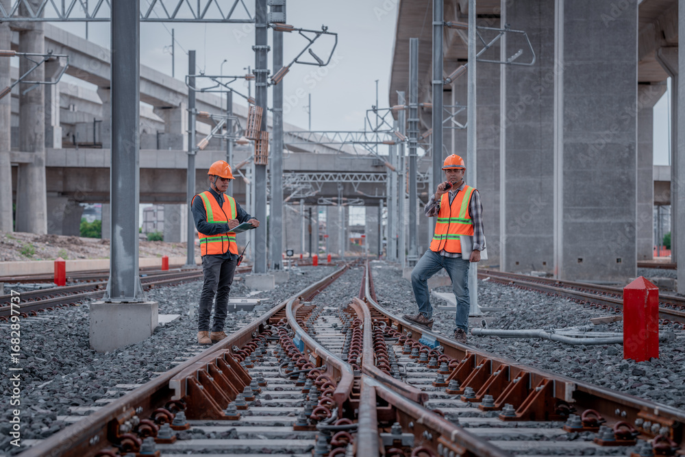 Construction engineer inspecting railway track industrial documents in hand while examining rail structure closely construction, safety and professional project management transportation development.