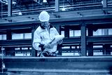 Construction engineer inspecting railway track industrial documents in hand while examining rail structure closely construction, safety and professional project management transportation development.