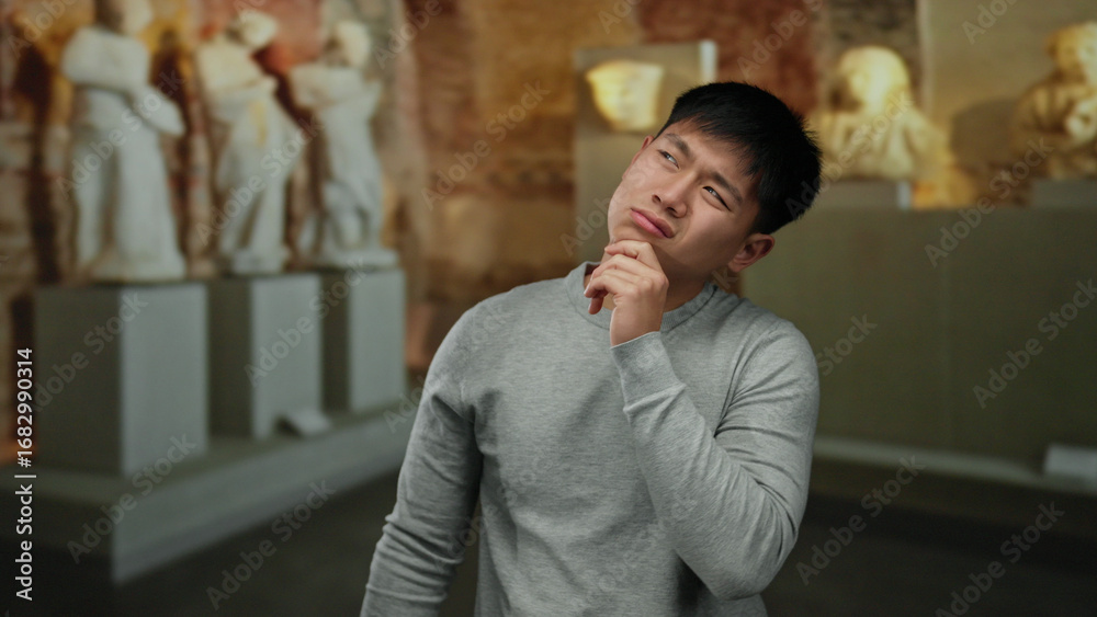 Young man in museum looking confused with ancient statues in the background, wearing casual gray sweater, expressing contemplation indoors with cultural art surroundings.