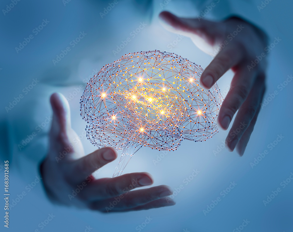 Human hands holding a glowing digital neural network brain - Artificial intelligence concept