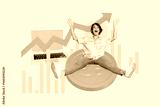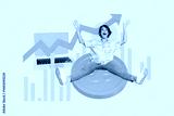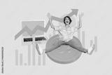 Poster trend collage image of excited businesswoman sit laptop chart development arrow progress dollar profit success income