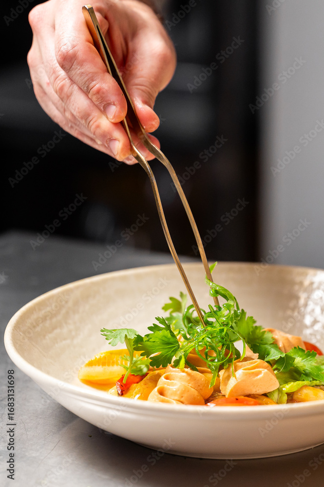 Chef plating pasta with herbs using precision tongs in a professional kitchen. Gourmet dish with creamy sauce, vegetables, and fine dining presentation