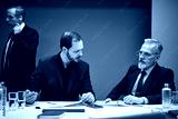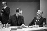 Caucasian young man discussing documents with manager colleague at table during business meeting while partner is standing in background using earpiece for phone call