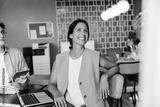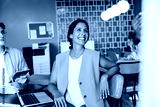 Smiling woman in a modern workspace during a group discussion
