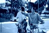 Interracial couple enjoying a joyful bike ride, celebrating love, diversity, and togetherness