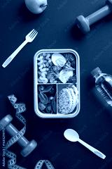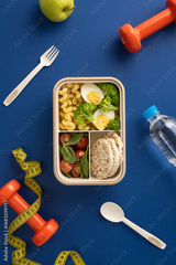 Balanced vertical meal in a lunchbox featuring eggs, vegetables, and pasta. Fitness and dieting props complement the healthy eating theme, showcasing tools for achieving a balanced lifestyle.