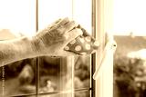 Home owner seen using a damp cloth to clean newly installed double glazed windows in a bedroom location. Part of the lush rear garden can be seen below.