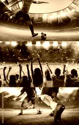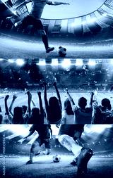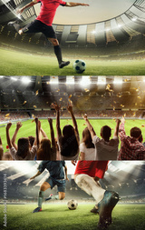 Collage of soccer game with striker kicking ball, celebrating fans, and close-up dynamic duel on 3D field. Concept of sports excitement, resilience, performance, and unforgettable football moments.