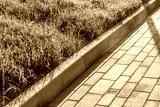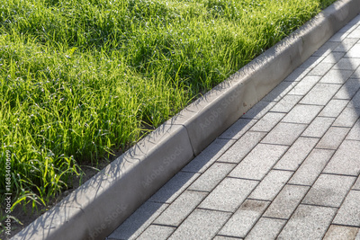 Green lawn next to paved walkway. Landscaped courtyard element with grass and stone path. Photo
