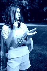 Student girl in city park with textbooks and small vitamin drink, thoughtfully planning or dreaming. Education, youth, learning in public urban nature space