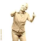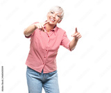 Playful smiling adult woman touching you, isolated on white background. Amusing middle aged woman.