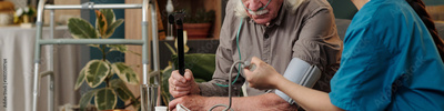 Senior Caucasian man with oxygen tube sitting at table holding cane while female healthcare worker measuring blood pressure using medical device in home setting