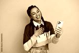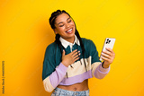 Young woman with braided hair holding a smartphone and smiling happily against a bright yellow background
