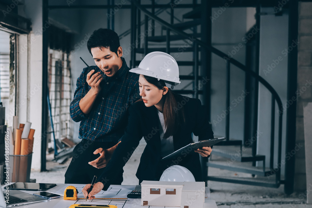 Construction manager and engineer dressed in orange work vests and hard helmets explore construction documentation on the building site near the steel frames