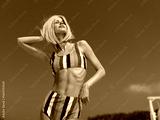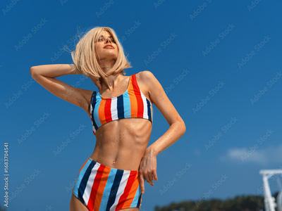 Smiling woman in colorful striped swimsuit posing against clear blue sky on sunny day wearing sunglasses and enjoying summer outdoors.
