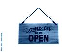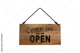 Wooden open hanging signboard. Vintage made of wood door sign for cafe, restaurant, bar or retail store. Announcement banner, information signage for business or service. Vector illustration