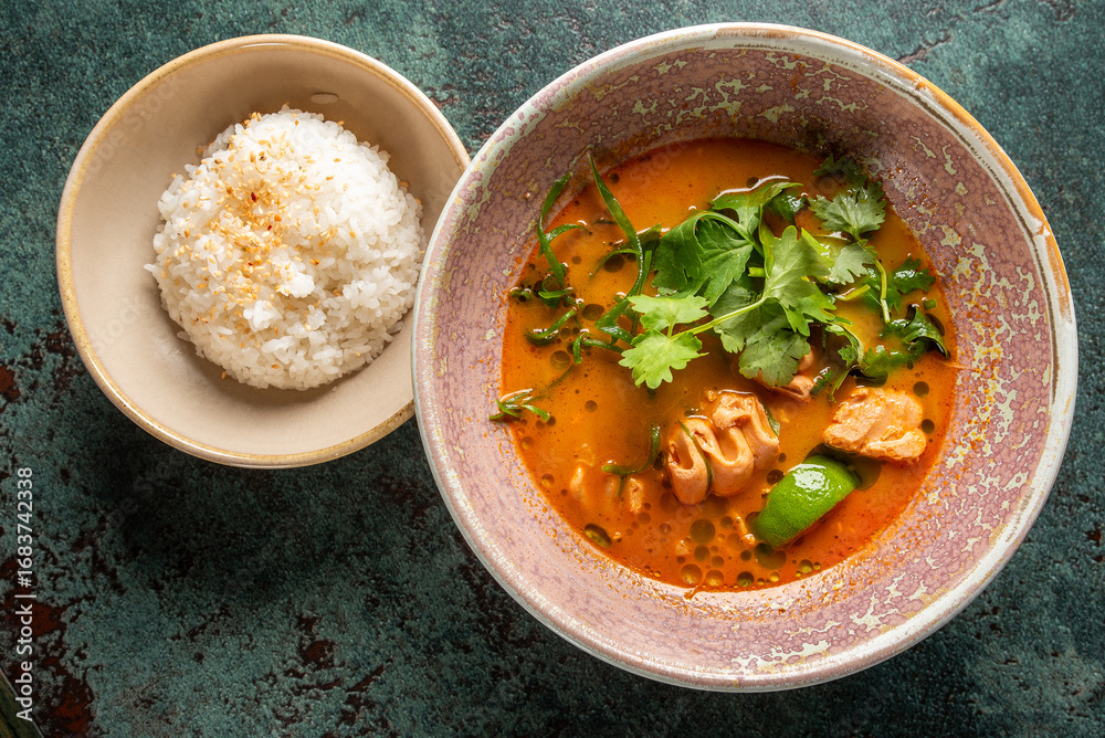 Thai red curry soup with chicken, lime, and cilantro served alongside steamed white rice in rustic bowls. Traditional Asian cuisine, vibrant colors, top view