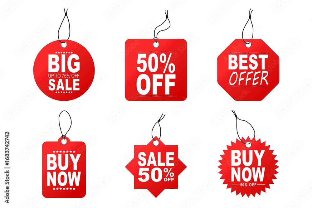 Realistic red price tags collection. Special offer or shopping discount label. Retail paper sticker. Promotional sale badge with text. Vector illustration. Black Friday and Cyber Week and Cyber Monday