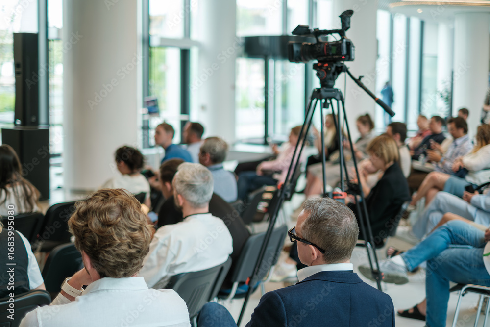 Business seminar with engaged audience in modern bright venue, with professional camera setup.