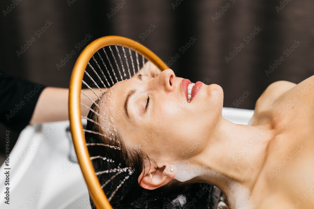 Woman enjoying hydromassage therapy in a serene spa environment, with soothing water cascading over her head, promoting relaxation and rejuvenation through aqua massage techniques