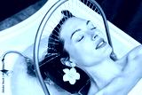 Woman enjoying hydromassage therapy in a spa setting, relaxing with water flowing gently over her head, surrounded by calming ambiance and soothing elements for ultimate relaxation experience