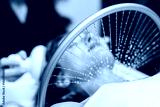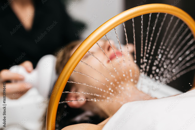 Asian woman receiving hydromassage head treatment at a Japanese spa, with water jets providing relaxation and rejuvenation, enhancing the overall wellness experience in a serene environment
