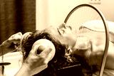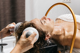 Woman receiving hydromassage head treatment in spa, water flowing gently, massager in use, creating a serene and relaxing atmosphere for rejuvenation and wellness