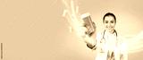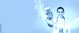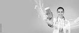 A healthcare professional smiles while holding a prescription bottle against a light blue background.