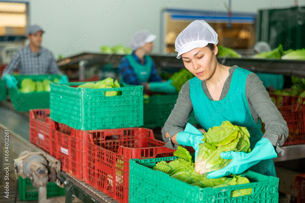 Asian woman in uniform during sorting lettuce at warehouse at vegetable factory