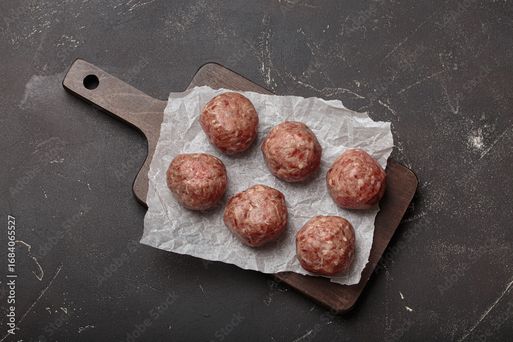 Six raw meatballs resting on a wooden cutting board lined with parchment paper, preparing for cooking