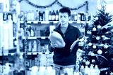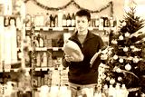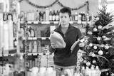 Adult man buyer chooses laundry detergent and cleaning spray in household chemicals store decorated for christmas