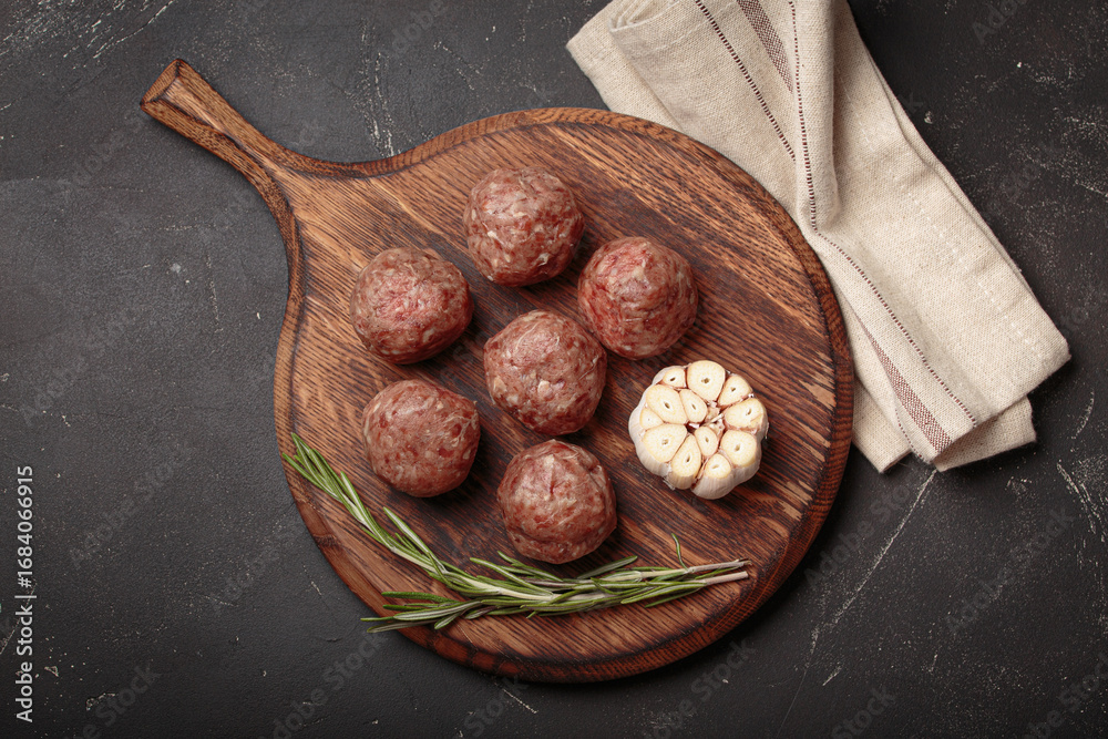Raw meatballs seasoned with rosemary and garlic sit on a round wooden cutting board, ready to be cooked and enjoyed as a delicious meal