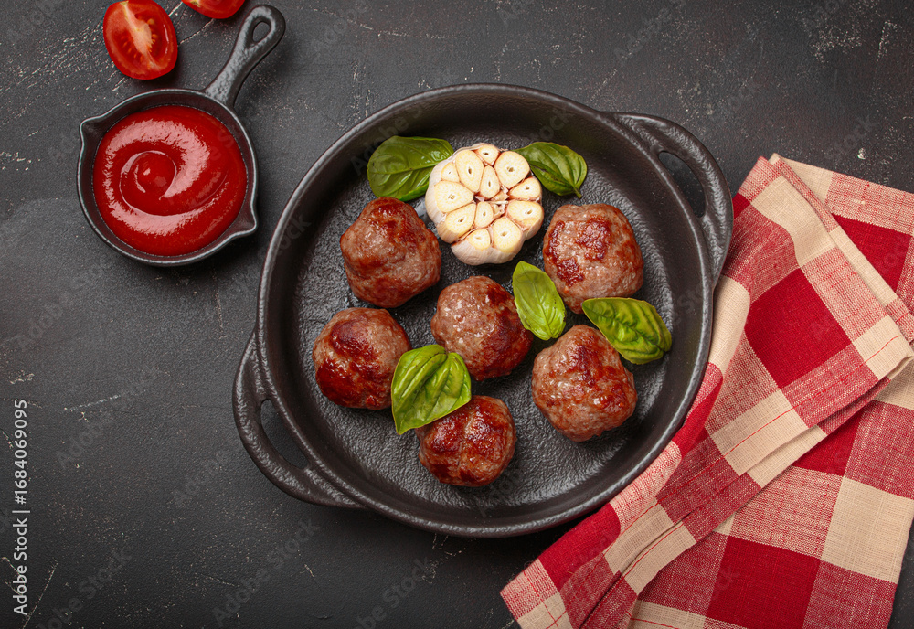 Fried meatballs in a cast iron pan, surrounded by basil, aromatic garlic, and tomato sauce on black background, healthy home cooking