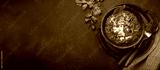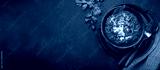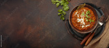 Dal makhani with cream and coriander leaves served in rustic bowl, accompanied by spices such as turmeric, cinnamon, and star anise, authentic Indian dish, copy space
