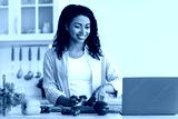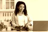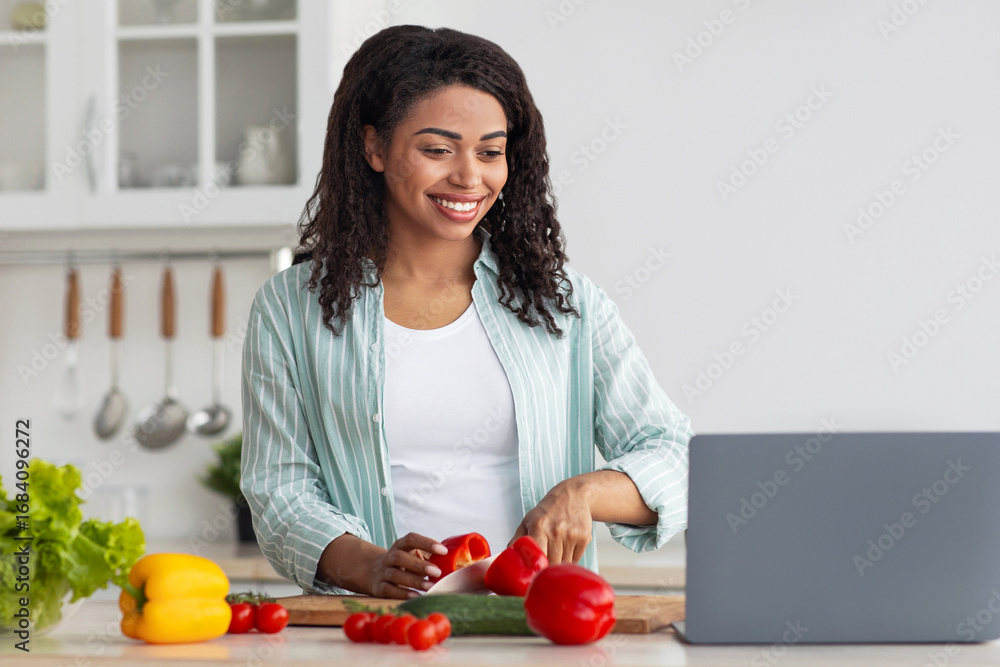 Online lesson, food class remotely, new normal and modern cooking. Smiling millennial african american female cuts pepper and looks at laptop in kitchen interior with bright vegetables on table