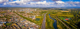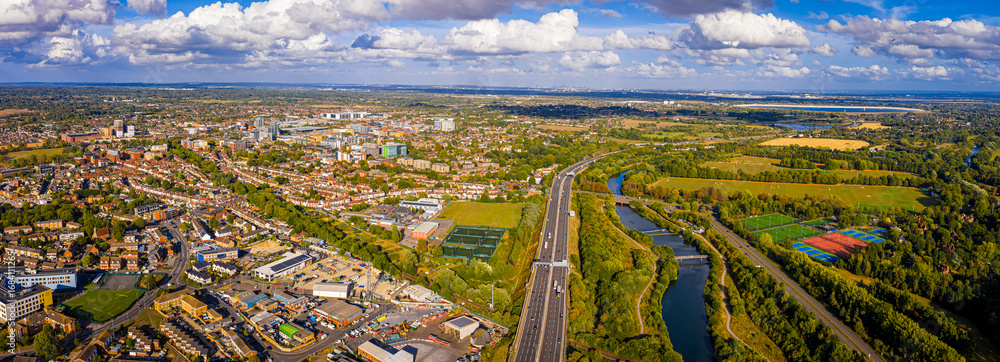 Aerial panoramic view of Slough town centre with modern buildings and green areas