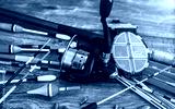 Fishing tackle on a old wooden table. Sport and recreation concept