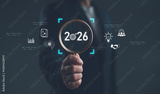 Businessman holding magnifying glass focusing on year 2026 with digital icons of innovation, AI, analytics, and global strategy. Concept of future planning, technology trends and vision.