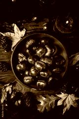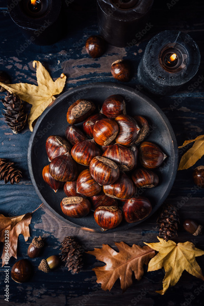Organic sweet chestnuts with pumpkins on kitchen table, prepared for baking or cooking